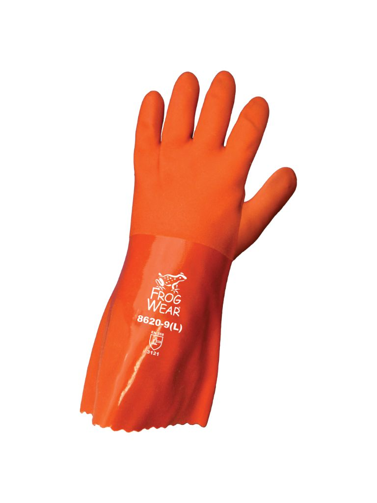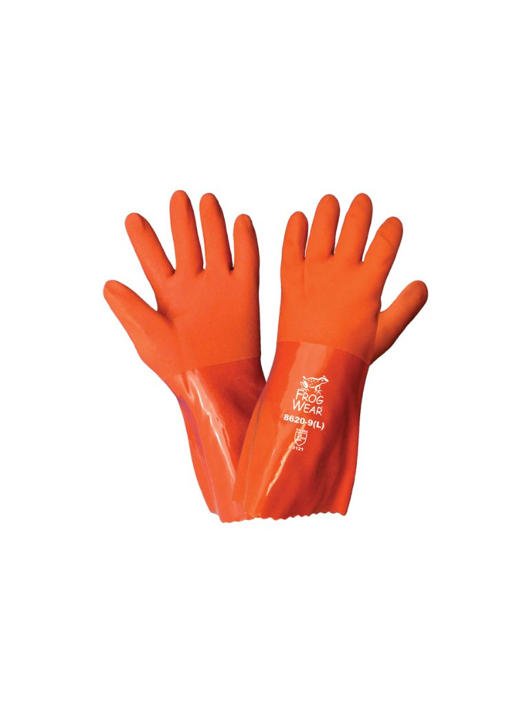 Los guantes FrogWear® 8620 son guantes de protección química de 12 pulgadas (30 cm) con doble sumersión en PVC premium sobre un forro de algodón seamless (sin costuras). Su acabado tipo lija (sandpaper grip) proporciona un agarre superior en condiciones húmedas, aceitosas o resbaladizas. Formulados específicamente para el manejo de residuos químicos, aceites y materiales grasos, mantienen flexibilidad en temperaturas bajas hasta -5°F (-20°C). Tratados con Actifresh® para controlar bacterias y reducir olores.
