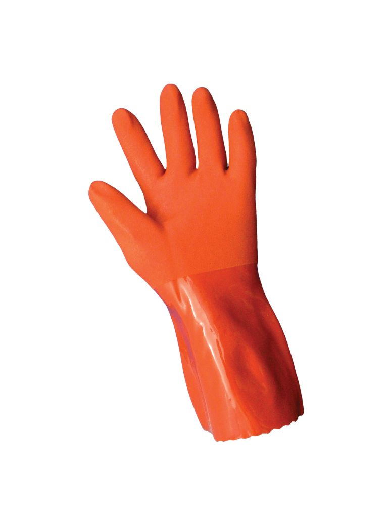 Guantes de 12″ con doble sumersión en PVC, forro seamless y acabado lija para manejo seguro de sustancias químicas, aceites y materiales grasos. Flexibles en frío hasta -5°F y con tratamiento antibacteriano.