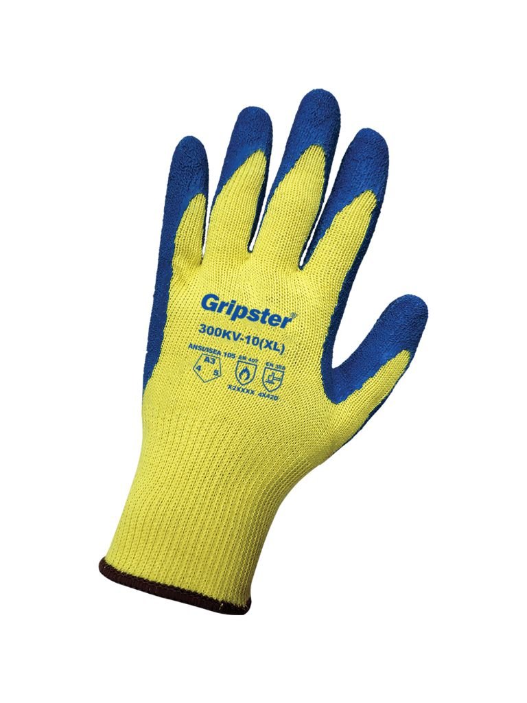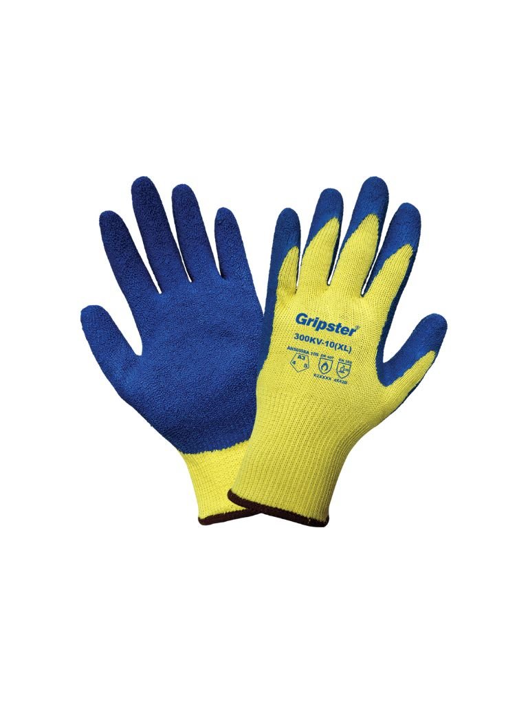 Los guantes Gripster® 300KV de Global Glove son guantes anticorte de alto rendimiento con liner seamless de 10 calibre en fibra DuPont™ Kevlar® (aramida) amarilla y poliéster, ofreciendo excelente resistencia al corte y al calor. La palma recubierta en látex de caucho natural azul con acabado grabado (etched) proporciona agarre superior en condiciones húmedas o secas, mayor resistencia a perforaciones que el nitrilo o poliuretano, y mantiene flexibilidad en bajas temperaturas.