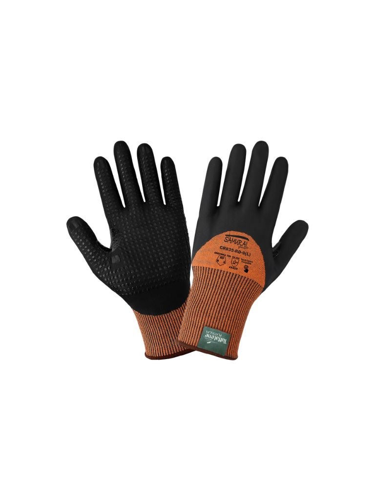 Los guantes Samurai Glove® CR835-RD de Global Glove son guantes anticorte de alto rendimiento con liner seamless de 15-gauge en Tuffalene® Platinum UHMWPE naranja de alta visibilidad. Esta innovadora fibra libre de vidrio y metal ofrece mayor comodidad, durabilidad y protección al corte, manteniendo una resistencia a perforaciones comparable a fibras reforzadas, pero con mayor transpirabilidad y vida útil gracias a su abrasión inherente. El recubrimiento 3/4 en espuma de nitrilo negro con puntos de nitrilo proporciona agarre superior en seco, húmedo o aceitoso, junto con compatibilidad touch screen para uso con dispositivos móviles.