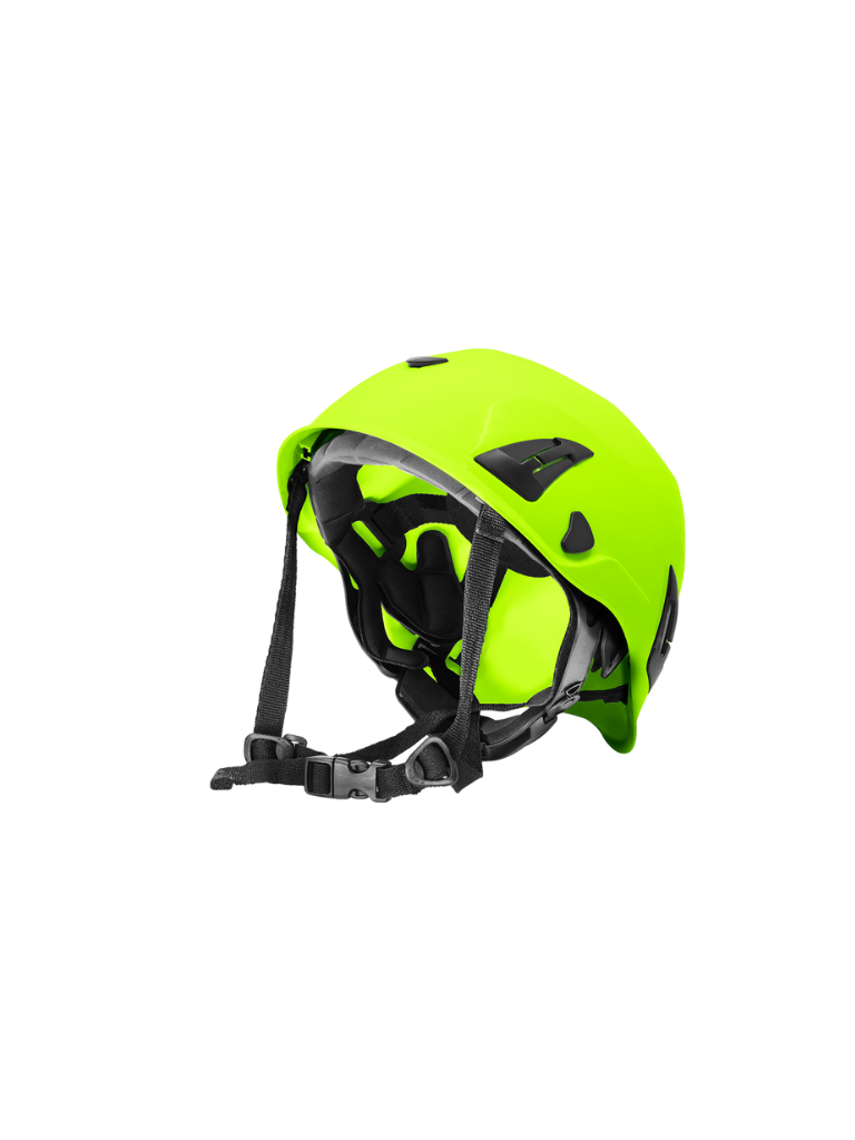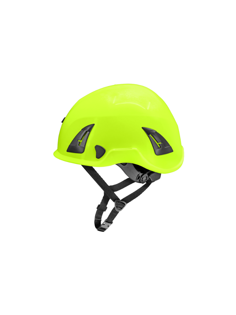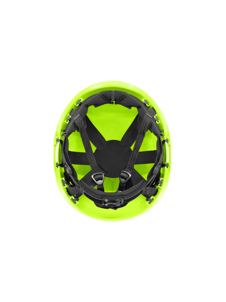 Su suspensión de seis puntos con ajuste por rueda (ratchet) permite adaptar el casco fácilmente a la hora de colocarlo, mientras que la correa de barbilla de cuatro puntos proporciona un ajuste firme y seguro, ideal para trabajos de escalada, altura y servicios utilitarios.